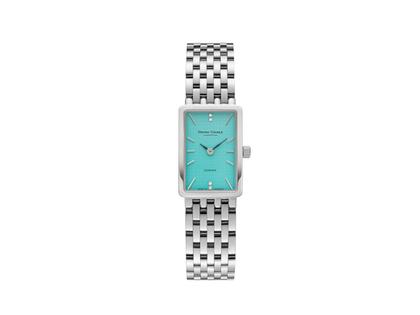 Quarzwerk (Basiswerk Ronda 1062 in veredelter Ausführung), poliertes Edelstahlgehäuse mit den Abmessungen von 30,0 x 20,0 mm, Höhe 6,0 mm, türkisfarbenes Zifferblatt mit Prägung, schwarzer Stunden- und Minutenzeiger, silberfarbene Indizes, je 2 systhetische Diamanten als Stundenindizes auf 6 und 12 Uhr, poliertes mehrgliedriges Edelstahlarmband mit Faltschließe, Saphirglas innen entspiegelt, Edelstahl-Gehäuseboden, 3 bar wasserdicht