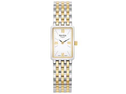 rechteckige Damenuhr, Quarz (Basiswerk Ronda 1062), mit einem Edelstahlgehäuse im Maß von 30 x 20 mm, Höhe 6 mm, weißes Zifferblatt, Edelstahlband mit Faltschließe, teilweise IP vergoldet, innen entspiegeltes Saphirglas, 3 bar wasserdicht