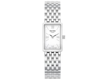 rechteckige Damenuhr, Quarz (Basiswerk Ronda 1062), mit einem Edelstahlgehäuse im Maß von 30 x 20 mm, Höhe 6 mm, weißes Zifferblatt, Edelstahlband mit Faltschließe, innen entspiegeltes Saphirglas, 3 bar wasserdicht