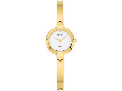 runde Damenuhr, Quarzwerk Ronda 1062 in veredelter BS-Version, Edelstahlgehäuse gelbgold IP beschichtet mit einem Durchmesser von 24,0 mm, weißes Zifferblatt mit 1 Brillant W (H) si 0,005 ct, Edelstahlband gelbgold mit Faltschließe, auf der Innenseite entspiegeltes Saphirglas, 3 bar wasserdicht