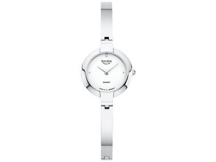 runde Damenuhr, Quarzwerk Ronda 1062 in veredelter BS-Version, Edelstahlgehäuse mit einem Durchmesser von 24,0 mm, weißes Zifferblatt mit 1 Brillant W (H) si 0,005 ct, Edelstahlband mit Faltschließe, auf der Innenseite entspiegeltes Saphirglas, 3 bar wasserdicht