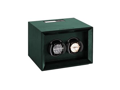 Uhrenbeweger für zwei Uhren mit handgefertigtem Vollledergehäuse in Grün, Interieur aus grünem Leder, 2 Time Mover®, Menüsteuerung auf Oberseite, 23,6 cm breit, 16,9 cm hoch, 21,2 cm tief