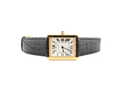 Armbanduhr Tank Solo Large, Gehäuse aus 750/- Roségold, Edelstahlboden, 34,8 x 27,4 mm, ca. 5,5 mm hoch, Krone mit Saphir-Cabochon, Saphirglas, 3 bar wasserdicht, schwarzes originales Alligatorband, Bandanstoß 20 mm, Dornschließe aus massivem Gold
