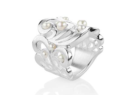Perlentau Damenring, 925/- Silber, mit 8 kleinen Süßwasserperlen, Ringbreite ca. 25 mm breit