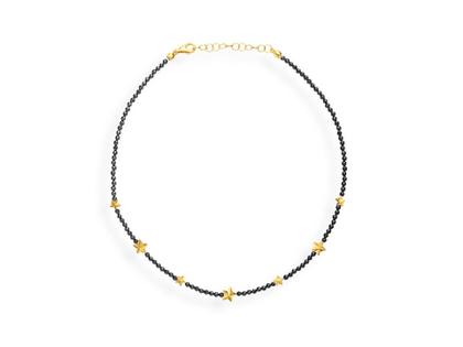 Collier Sterne und Kalotten, 925/-Silber gelbgoldplattiert, mit facettierten Onyxen im Durchmesser von 3 mm, mit Verlängerungskettchen und Karabinerverschluss, 42-47 cm lang