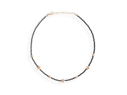 Collier Sterne und Kalotten, 925/-Silber rotgoldplattiert, mit facettierten Onyxen im Durchmesser von 3 mm, mit Verlängerungskettchen und Karabinerverschluss, 42-47 cm lang