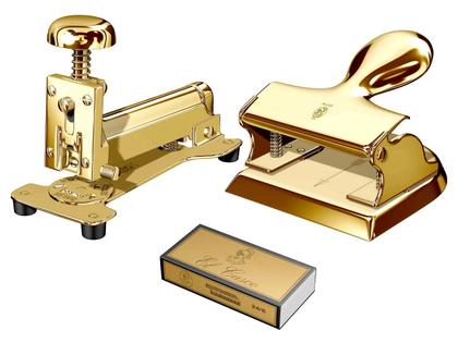 Tischhefter und Locher gefertigt aus Stahl und teilweise Zinnguss, in 23-Karat vergoldet, handpoliert - inklusive Geschenkbox