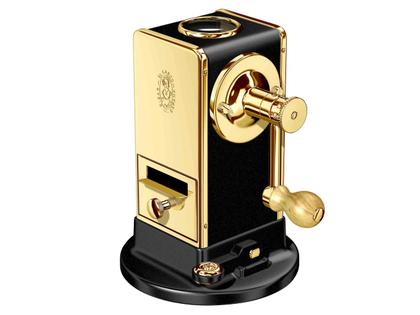 Spitzmaschine mit Handkurbel aus Stahl und Zamak, schwarz lackierter Korpus mit 23-Karat vergoldeten Details, Einstellbare Spitzlängen, Saugfuß, handpoliert - inklusive Geschenkbox