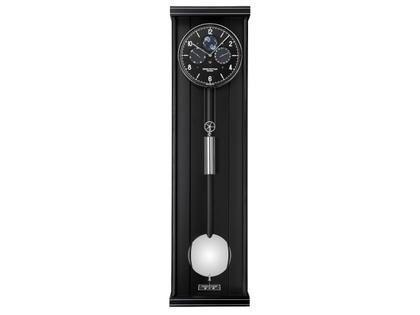 Seilzugregulator Sattler Kaliber 1565-4 mit einer Gangdauer von 30 Tagen, Antrieb durch 1.600 g Gewicht an loser Rolle, Gangreglung durch Holzstabpendel mit massiver gedrehter polierter und vernickelter Messinglinse, 4 Präzisionskugellager, 7 Rubinlager, schwarz lackiertes Holzgehäuse mit Metallintarsien, Höhe 96,0 cm, Breite 25,5 cm, Tiefe 11,0 cm, Gewicht 10,0 kg, zweiteiliges Zifferblatt schwarz eloxiert, Datumsanzeige auf 3 Uhr, Wochentagsanzeige auf 9 Uhr, handbemalte Mondphasenanzeige auf 12 Uhr, weiße arabische Ziffern und Indizes, silberfarbener Stahl-Zeiger, weiße Minuterie, Mineralglas entspiegelt, Tür mit Magnetverschluss, versteckte Klappe für Aufzugskurbel im Boden