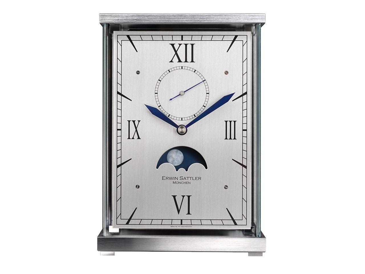 Tischuhr mit Sattler Kaliber 2004 mit einer Gangdauer von 8 Tagen, Gehäuse aus Messing geschliffen und verchromt, Zifferblatt eloxiert und handbemalte Mondscheibe, Mineralglas geschliffen, Passageschlag zur vollen Stunde auf eine Glocke, aufziehen und komplette Einstellung auf der Rückseite der Uhr