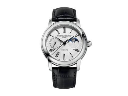 Automatikwerk FC-712, 38 Stunden Gangreserve, Edelstahlgehäuse poliert, Durchmesser 42,0 mm, Höhe 13,0 mm, silbernes Zifferblatt mit Datum und Mondphase, schwarzes Lederarmband mit Faltschließe, Saphirglas gewölbt, Glasboden, 5 bar wasserdicht