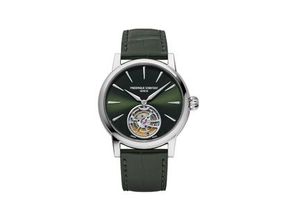 Automatikwerk FC-980-4, 38 Stunden Gangreserve, 33 Rubine, Anker und Ankerrad aus Silizium, Edelstahlgehäuse poliert, Durchmesser 39,0 mm, Höhe 10,99 mm, grünes Sonnenschliff-Zifferblatt, sichtbarer Tourbillon-Käfig auf 6 Uhr, dunkelgrünes Alligator-Lederarmband mit Faltschließe , Saphirglas gewölbt, Glasboden, 5 bar wasserdicht - limitiert auf 150 Exemplare weltweit