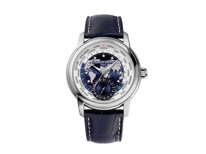 Automatikwerk FC-718, 38 Stunden Gangreserve, Edelstahlgehäuse poliert, Durchmesser 42,0 mm, Höhe 12,1 mm, weiß-blaues Zifferblatt mit Datum bei 6 Uhr, Tag- / Nacht-Anzeige, Zweite Zeitzone, blaues Alligator-Lederarmband mit Faltschließe, Saphirglas gewölbt, Glasboden, 5 bar wasserdicht