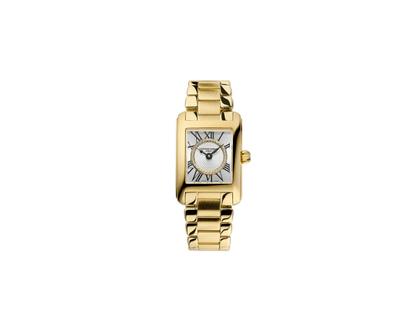 Quarzwerk FC-200 mit einer Batterielaufzeit von 72 Monaten, poliertes Edelstahlgehäuse gelbgoldfarben-PVD beschichtet mit den Abmessungen von 30,0 x 21,0 mm, Höhe 5,8 mm, Edelstahl-Krone gelbgoldfarben-PVD beschichtet, weißes Sonnenschliff-Zifferblatt mit Guilloché-Muster und Diamant-Kranz bestehend aus 35 Brillanten zusammen 0,060 ct, schwarzer Stunden- und Minutenzeiger, schwarze römische Ziffern, poliertes Edelstahlarmband mit Faltschließe gelbgoldfarben-PVD beschichtet, Saphirglas entspiegelt, Edelstahl-Gehäuseboden, 3 bar wasserdicht