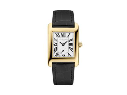 Frederique Constant Classics Carree Small Seconds Quarz Edelstahl Gelbgold-PVD 36x25mm weißes Zifferblatt schwarzes Lederband