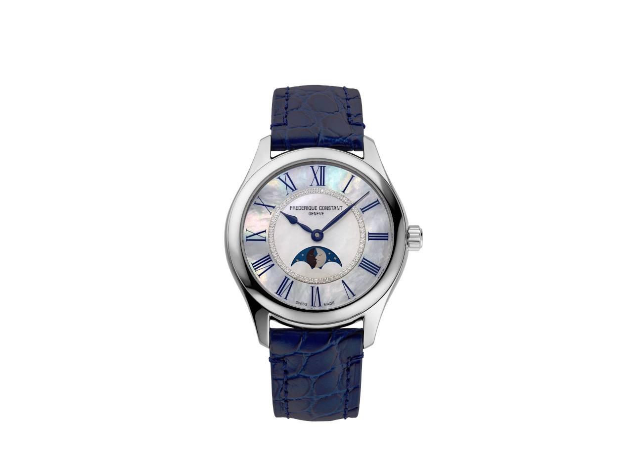 Automatikwerk FC-331 mit einer Gangreserve von 38 Stunden, poliertes Edelstahlgehäuse im Durchmesser von 36,0 mm, Höhe 10,6 mm, weißes Perlmutt-Zifferblatt mit Brillant-Kranz, silberfarbener Stunden- und Minutenzeiger, blaue römische Ziffern, Mondphase, blaues Kalbslederarmband mit Kroko-Prägung und Edelstahl-Faltschließe, zusätzliches dunkelblaues Lederband mit größerem Alligator-Muster zum schnellen Wechseln, Saphirglas entspiegelt, Saphirglasboden, 5 bar wasserdicht