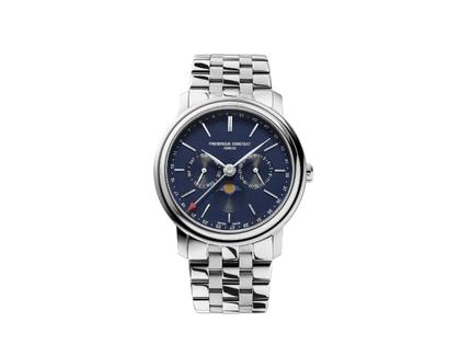 Quarzwerk FC-270, Edelstahlgehäuse poliert, Durchmesser 40,0 mm, Höhe 9,94 mm, dunkelblaues Zifferblatt mit Datums- und Wochentagsanzeige, Mondphase, Skala für Wochen des Jahres, Edelstahlarmband mit Faltschließe, gewölbtes Saphirglas, Edelstahlboden, 6 bar wasserdicht