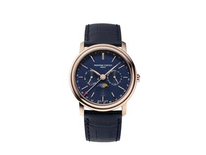 Quarzwerk FC-270, Edelstahlgehäuse PVD-Roségold poliert, Durchmesser 40,0 mm, Höhe 9,94 mm, dunkelblaues Zifferblatt mit Datums- und Wochentagsanzeige, Mondphase, Skala für Wochen des Jahres, blaues Lederarmband mit Dornschließe, gewölbtes Saphirglas, Edelstahlboden, 6 bar wasserdicht