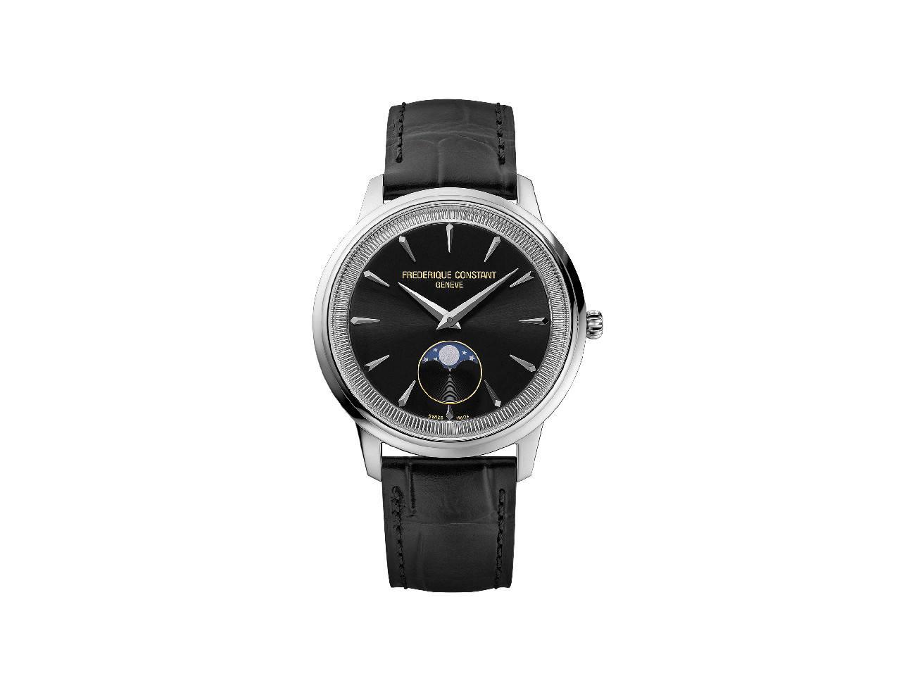 Quarzwerk FC-206 mit einer Gangdauer von 60 Monaten, poliertes Edelstahlgehäuse im Durchmesser von 37,0 mm, Höhe 7,6 mm, schwarzes Sonnenschliff-Zifferblatt, Mondphasen-Anzeige auf 6 Uhr, silberfarbene Zeiger und Indizes, schwarzes Kalbslederarmband mit Edelstahl-Dornschließe, Saphirglas entspiegelt, Edelstahl-Gehäuseboden, 5 bar wasserdicht