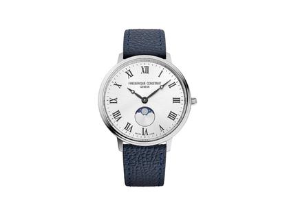 Frederique Constant Classics Moonphase Quarz Edelstahl 39mm weißes Zifferblatt blaues Lederband
