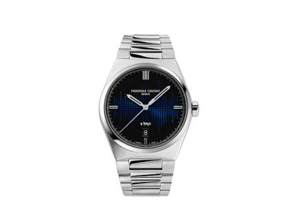 Automatikwerk FC-303 mit einer Gangreserve von 38 Stunden, Edelstahlgehäuse im Durchmesser 39,0 mm, Höhe 10,34 mm, matt-schwarzes Zifferblatt mit blauem Schallwellenmuster, Datumsanzeige auf 6 Uhr, aufgesetzte silberne Zeiger und Indizes, Edelstahlarmband mit Faltschließe plus zusätzlichem schwarzem Kautschukarmband, gewölbtes Saphirglas, entspiegelt, Glasboden, 10 bar wasserdicht, limitiert auf 432 Exemplare weltweit