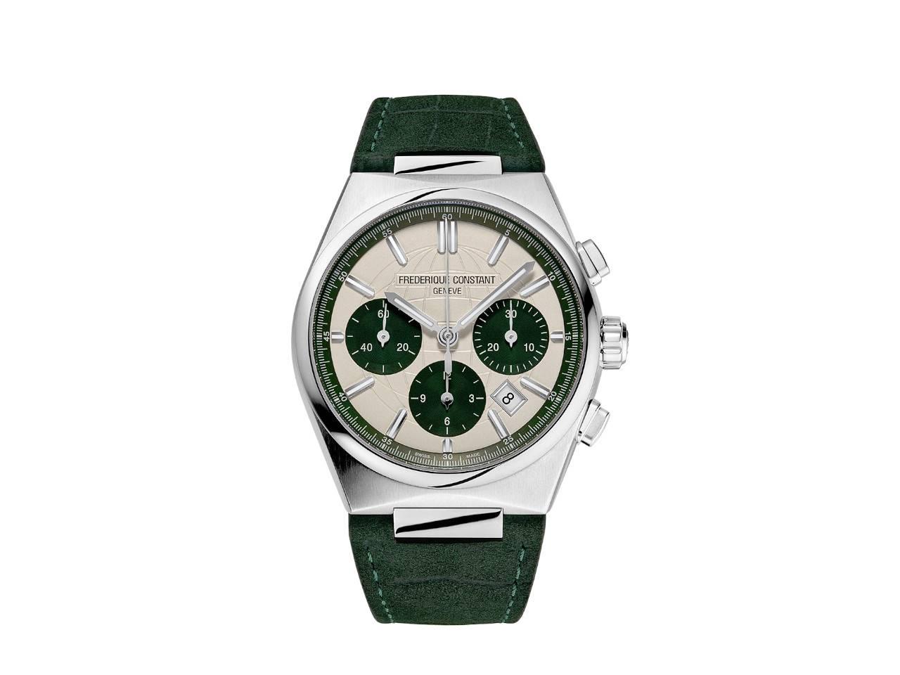Die Frederique Constant Vorzeigekollektion Highlife, feiert in diesem Jahr ihr 25-jähriges Jubiläum und bietet zu diesem Anlass eine neue Variationen ihres Sportmodells, Chronograph Automatic mit 41,0 mm Gehäusedurchmesser. Diese auf 1888 Exemplare limitierte Version mit Edelstahlgehäuse und der neuartigen Kombination eines Opalin-Zifferblatts mit grünen Zählern unterstreicht den sportlichen und zeitgenössischen Geist der Kollektion. Jedes Exemplar wird vom Kaliber FC-391 mit einer 60 stündigen Gangreserve angetrieben und mit einem austauschbaren Edelstahlarmband geliefert.