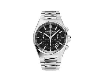 Automatikwerk FC-391, 60 Stunden Gangreserve, Chronograph, Edelstahlgehäuse poliert, Durchmesser 41,0 mm, Höhe 14,2 mm, schwarzes Zifferblatt mit Datum zwischen 4 und 5 Uhr, Edelstahlarmband mit Faltschließe, mit zusätzlichem schwarzen Kautschukarmband, Saphirglas gewölbt, entspiegelt, Glasboden, 10 bar wasserdicht