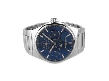 Automatikwerk FC-775, 38 Stunden Gangreserve, Edelstahlgehäuse poliert, Durchmesser 41,0 mm, Höhe 12,6 mm, blaues Zifferblatt mit Zeiger-Datum bei 3 Uhr, Ewiger Kalender, Wochentags-Anzeige und Monatsanzeige, Mondphase bei 6 Uhr, Edelstahlband mit Faltschließe, mit zusätzlichem Kautschuk-Armband, Saphirglas gewölbt, Glasboden, 5 bar wasserdicht