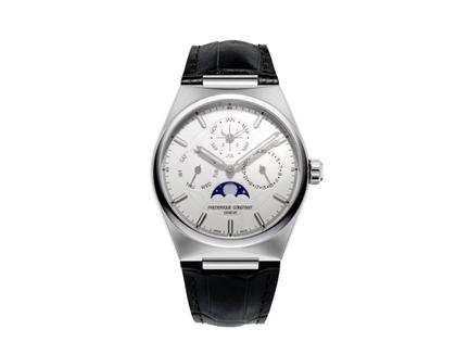 Automatikwerk FC-775, 38 Stunden Gangreserve, Edelstahlgehäuse poliert, Durchmesser 41,0 mm, Höhe 12,6 mm, weißes Zifferblatt mit Zeiger-Datum bei 3 Uhr, Ewiger Kalender, Wochentags-Anzeige und Monatsanzeige, Mondphase bei 6 Uhr, Lederband mit Faltschließe, mit zusätzlichem Kautschuk-Armband, Saphirglas gewölbt, Glasboden, 5 bar wasserdicht