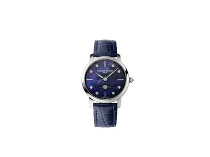 Frederique Constant Slimline Ladies Moonphase Quarz Edelstahl 30mm Perlmutt-Zifferblatt blaues Lederband