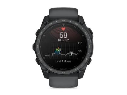Multifunktion GPS Smartwatch, schwarzes faserverstärktes Polymergehäuse und Rückseite aus Titan mit Cerakote®-Beschichtung in Schiefergrau, Durchmesser 51,0 mm, Höhe 14,7 mm, Titan-Lünette mit Cerakote®-Beschichtung, 1,4 Zoll AMOLED-Touchdisplay, zweifarbiges Silikonarmband mit Dornschließe, Saphirglas, 10 bar wasserdicht