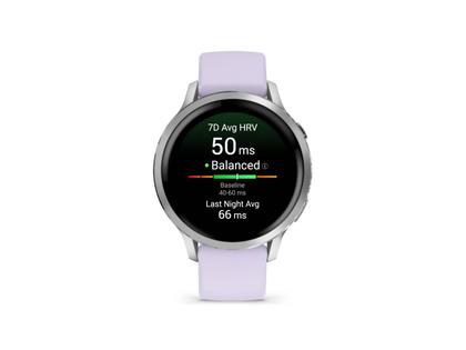 Garmin Venu 4 Quarz Edelstahl und Polymer 41mm digitales Zifferblatt violettes Silikonband