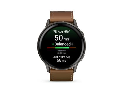 Garmin Venu 4 Quarz Edelstahl und Polymer Schiefergrau 45mm digitales Zifferblatt braunes Lederband