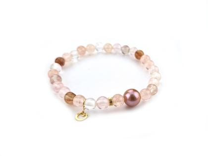 Armschmuck aus einer pinken Ming-Zuchtperle semi rund, 8 - 9 mm im Durchmesser und verschiedenfarbigen Rutilquarz- und Morganitperlen, Ronde und Gellner "G" aus 750/- Gelbgold, elastisches Gummiarmband, Länge 16,5 cm