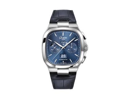 Glashütte Original Seventies Chronograph Panoramadatum Automatik Edelstahl 40mm blaues Zifferblatt blaues Lederband