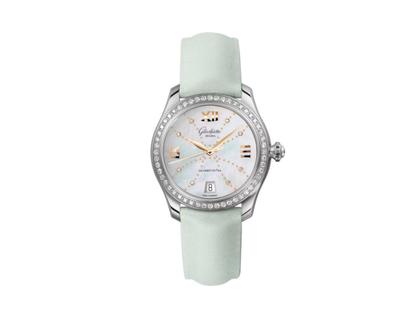 Glashütte Original Lady Serenade Automatik Edelstahl 36mm Perlmutt-Zifferblatt mit Brillanten mintgrünes Textilband