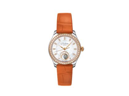 Glashütte Original Lady Serenade Luna Automatik Edelstahl 32,5mm weißes Zifferblatt oranges Lederband