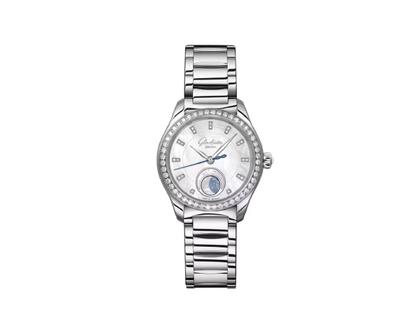 Glashütter Manufakturkaliber 35-14 mit einer Gangreserve von 60 Stunden, poliertes Gehäuse aus Edelstahl im Durchmesser von 32,5 mm, Höhe 8,9 mm, weißgoldfarbene Krone besetzt mit 1 Diamant im Rosenschliff 0,076 ct TW vvs, weißgoldfarbene Lünette besetzt mit 48 Brillanten 0,978 ct TW vvs, weißes Perlmutt-Zifferblatt mit Strahlenschliff-Oberfläche, polierter weißgoldfarbener Stunden- und Minutenzeiger, gebläuter Sekundenzeiger, polierte weißgoldene Stunden-Indizes besetzt mit 20 Brillanten zusammen 0,052 ct TW vvs, Mondphasenanzeige bestehend aus weißem Perlmutt Mond und Tahiti Nachthimmel auf 6 Uhr mit weißgoldener Sternenhimmel- Umrahmung, Edelstahlarmband mit Faltschließe, Saphirglas entspiegelt, Saphirglasboden, 3 bar wasserdicht