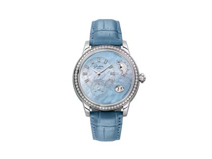 Automatik Kaliber 90, Duplex-Schwanenhals-Feinregulierung, Gehäuse Edelstahl, Durchmesser 39,4 mm, Höhe 12 mm, Lünette mit 64 Diamanten 0,95 ct TW vvsi, Krone mit 1 Brillant 0,10 ct TW vvsi, dezentrale Zeitanzeige, Panoramadatum, Mondphase, blaues Perlmutt-Zifferblatt mit 18 Brillanten 0,04 ct TW vvsi, blaugraues Louisiana-Alligator-Lederband mit Dornschließe, Saphirglas, Glasboden, 3 bar wasserdicht, 42h Gangdauer