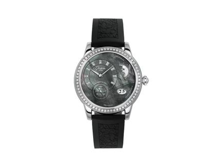 Automatik Kaliber 90, Duplex-Schwanenhals-Feinregulierung, Gehäuse Edelstahl, Durchmesser 39 mm, Höhe 12 mm, dezentrale Zeitanzeige, Panoramadatum, Mondphase, dunkles Tahiti-Perlmutt-Zifferblatt, schwarzes Kautschukband mit Dornschließe, insgesamt 83 Diamanten 1,101 ct TW if, beidseitig entspiegeltes Saphirglas, Glasboden, 3 bar wasserdicht, 42h Gangdauer