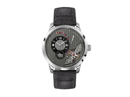 Handaufzug Kaliber 66, 41 Stunden Gangdauer, Gehäuse Edelstahl, Durchmesser 42,0 mm, Höhe 12,0 mm, freier Blick auf das Uhrwerk samt Duplex-Schwanenhals-Feinregulierung und Schraubenunruh, verschraubte Goldchatons, mit Streifenschliff polierte Platine, rhodiniert, dezentrale Zeitanzeige, Gangreserveanzeige, polierte Weißgoldzeiger, schwarzes Nubuk-Alligator-Lederband mit Faltschließe, beidseitig Saphirglas, 5 bar wasserdicht