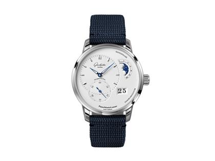 Glashütte Original PanoMaticLunar Automatik Edelstahl 40mm silbernes Zifferblatt blaues Textilband