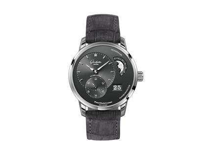 Automatik Kaliber 90, Gehäuse Edelstahl, Durchmesser 40 mm, Höhe 12,7 mm - graues Zifferblatt (Ruthenium), dezentrale Zeitanzeige, Panoramadatum, Mondphase, graues Nubuk-Alligator-Lederband, Faltschließe, beidseitig Saphirglas, 5 bar wasserdicht, 42h Gangdauer