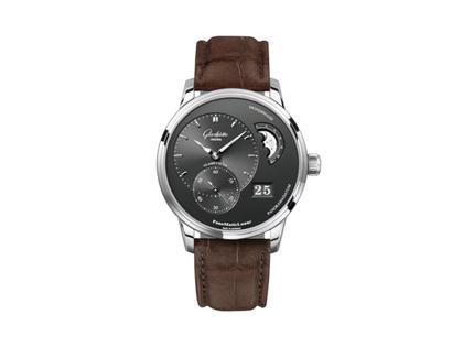 Automatik Kaliber 90, Gehäuse Edelstahl, Durchmesser 40 mm, Höhe 12,7 mm - graues Zifferblatt (Ruthenium), dezentrale Zeitanzeige, Panoramadatum, Mondphase, braunes Nubuk-Alligator-Lederband, Faltschließe, beidseitig Saphirglas, 5 bar wasserdicht, 42h Gangdauer