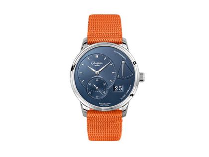 Glashütte Original PanoReserve Handaufzug Edelstahl 40mm blaues Zifferblatt oranges Textilband