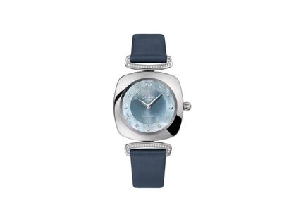 Lady Kollektion, Pavonina Damenuhr, Manufakturkaliber 03-02, Quarz, Werk hochfein vollendet, Zifferblatt aus Perlmutt, blau, Oberfläche mit Guillochierung, 8 Brillanten 0,04 ct TW vvsi, arabische Ziffern rhodiniert, Feuille-Zeiger rhodiniert, Magnetfeldschutz, Gehäuse aus Edelstahl, kissenförmig im Maß von 31 x 31 mm, Höhe 7,5 mm, Krone mit Brillant 0,03 ct TW vvsi, blaues Kalbslederband it Satinoptik, mit Edelstahl-Faltschließe, bewegliche Bandanstöße mit Brillanten 0,14 ct TW vvsi, beidseitig entspiegeltes Saphirglas, 5 bar wasserdicht