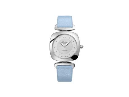 Glashütte Original Pavonina Quarz Edelstahl 31mm silberfarbenes Zifferblatt blaues Lederband