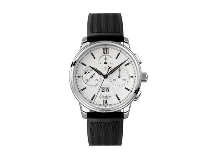 Glashütte Original Senator Chronograph Panoramadatum Automatik Edelstahl 42mm weißes Zifferblatt schwarzes Kautschukband