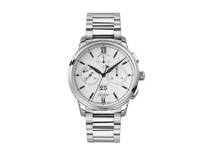 Glashütte Original Senator Chronograph Panoramadatum Automatik Edelstahl 42mm weißes Zifferblatt Metallband
