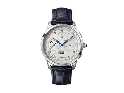 Glashütte Original Senator Chronograph Panoramadatum Automatik Platin 42mm weißes Zifferblatt blaues Lederband